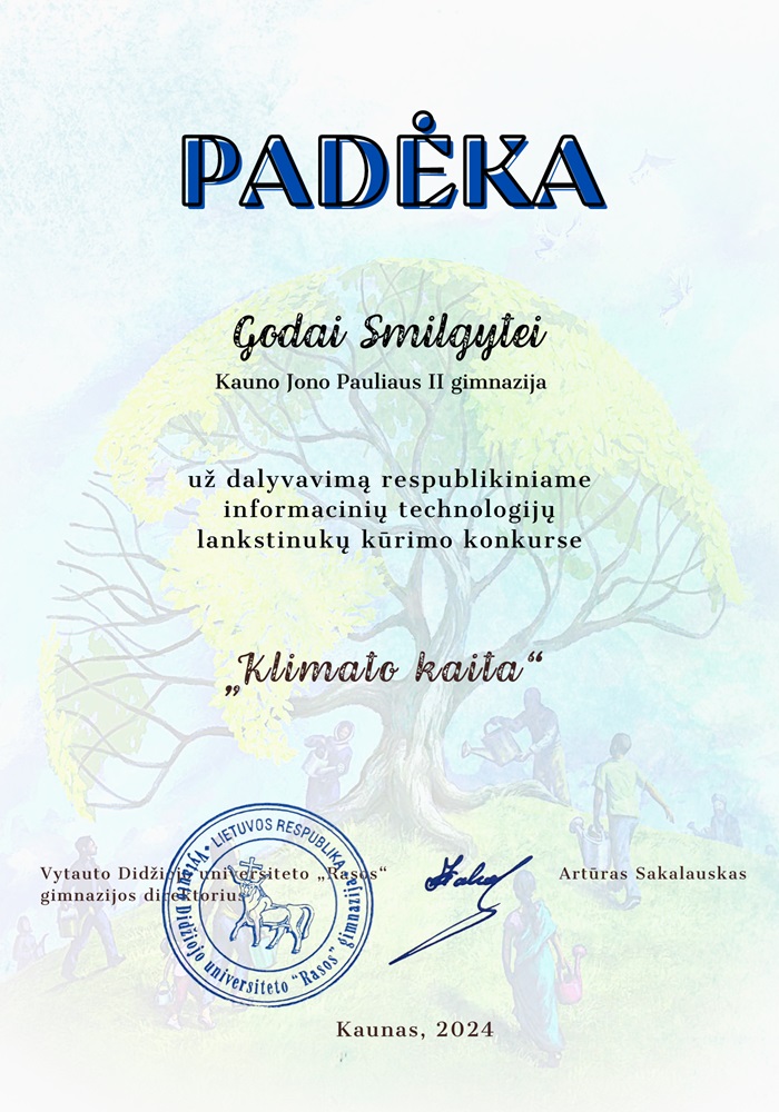 Sveikiname Akvilę Stakytę, Ie kl. užėmus 1 vietą ir Arną Kundrotą, Ic kl. užėmus 3 vietą respublikiniame IT lankstinukų „Klimato kaita“ kūrimo konkurse. Padėkas gavo Gerda Nikulina, Ib kl. ir Goda Smilgytė, Ie kl.