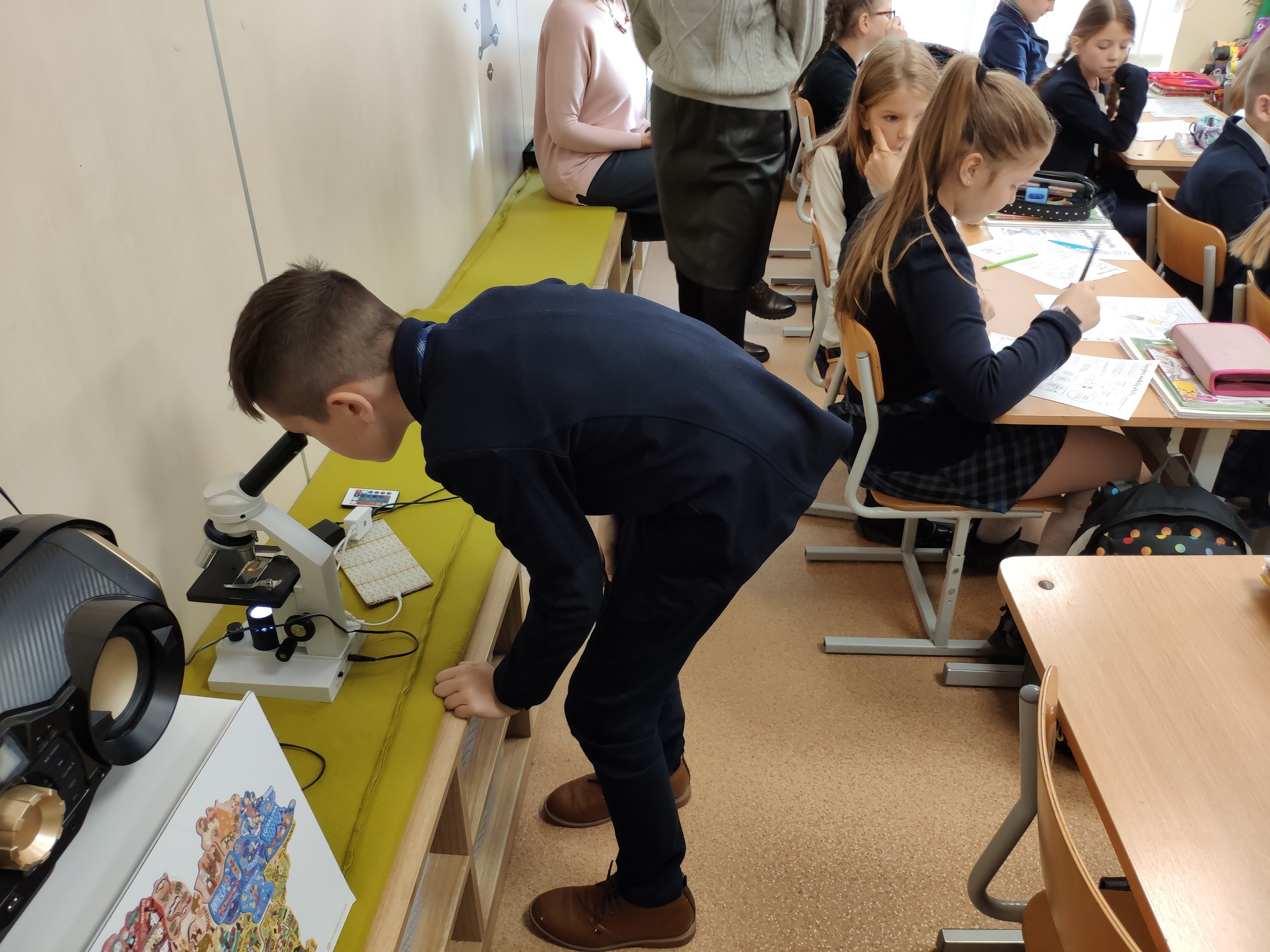 Projekto dalyviai džiaugiasi galimybe pamatyti mikroskopą, o per mikroskopą – ląsteles ir nuoširdžiai dėkoja už pagalbą bei bendradarbiavimą mokytojai Ramintai Svidinskaitei.